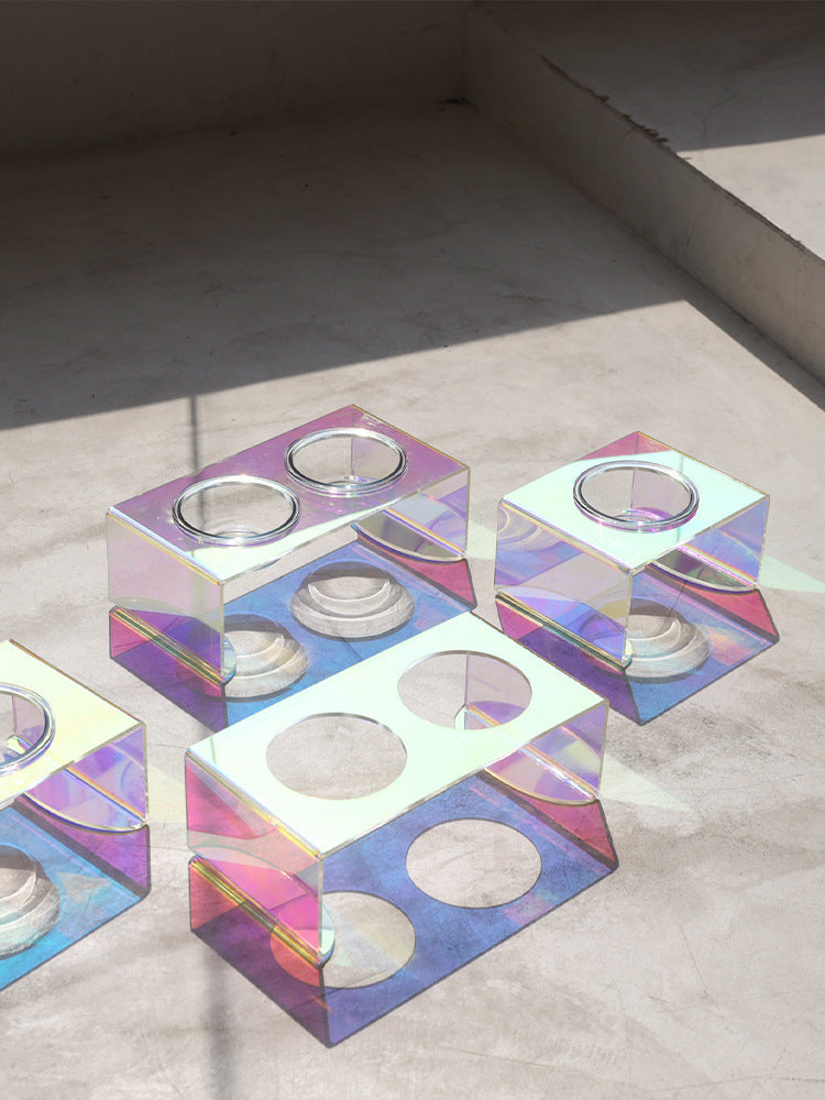 1. Acrylic pet feeder made of premium holographic acryl in aesthetic style perfectly blends into your modern interior.
