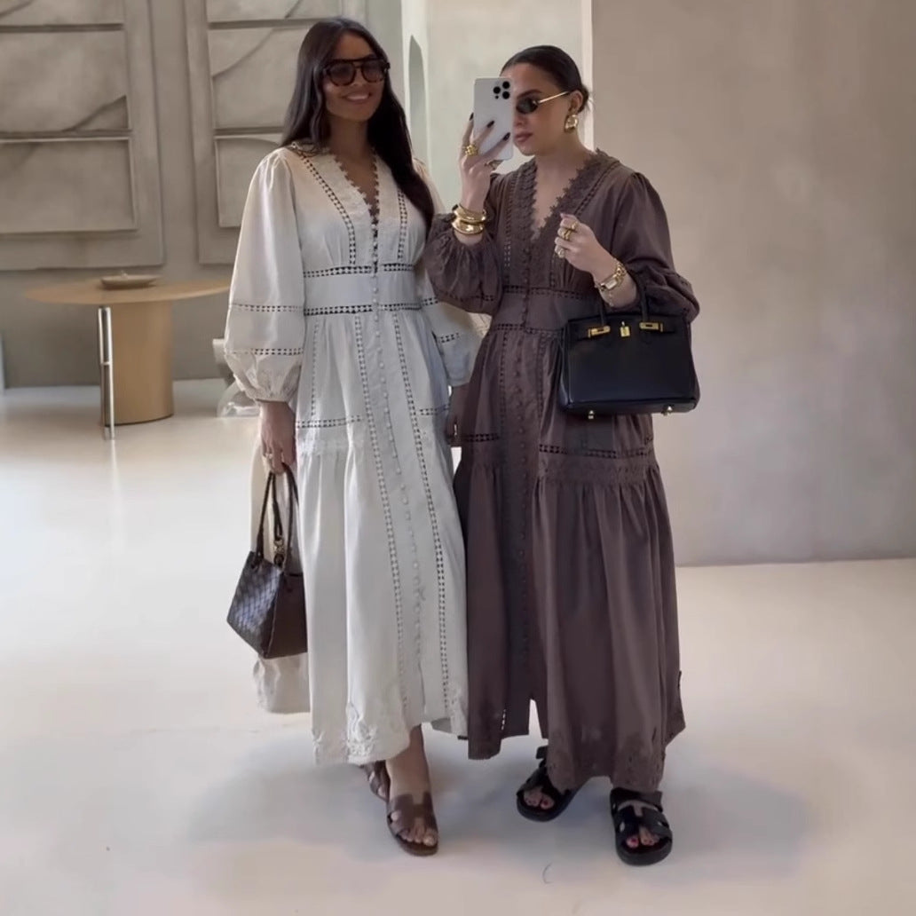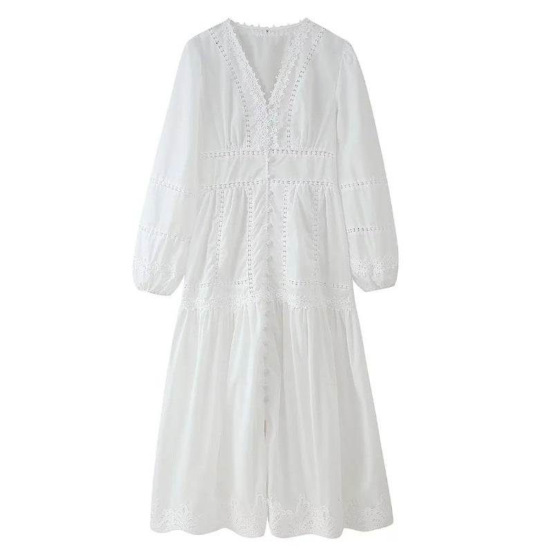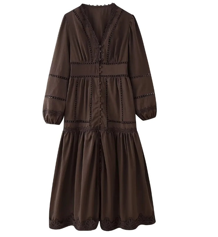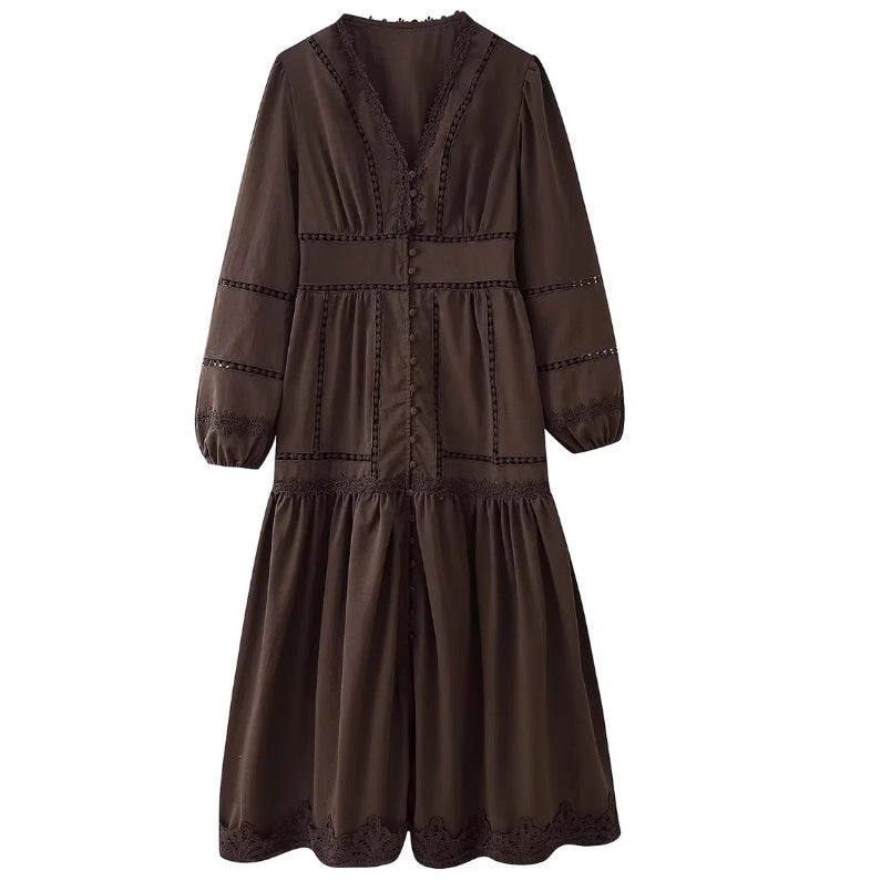 Cross-border European And American Women's AliExpress Explosions Temperament V-neck Stitching Lace Hollow-out Design Sense Long Sleeve Waisted Dress