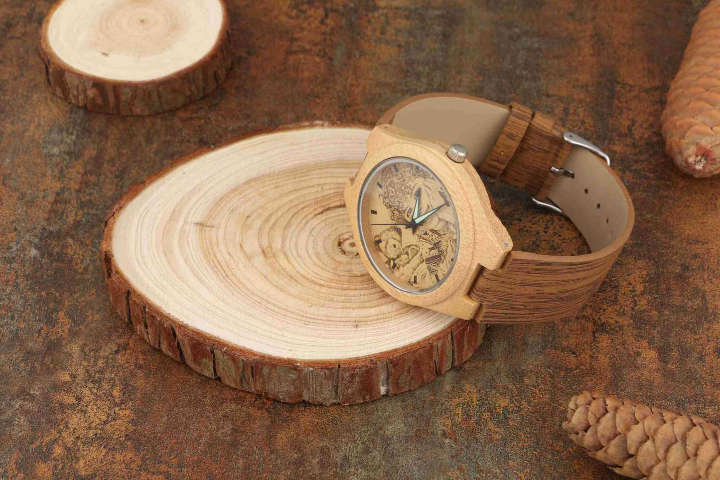 Women's Engraved Bamboo Photo Watch Wooden Leather Strap 40mm